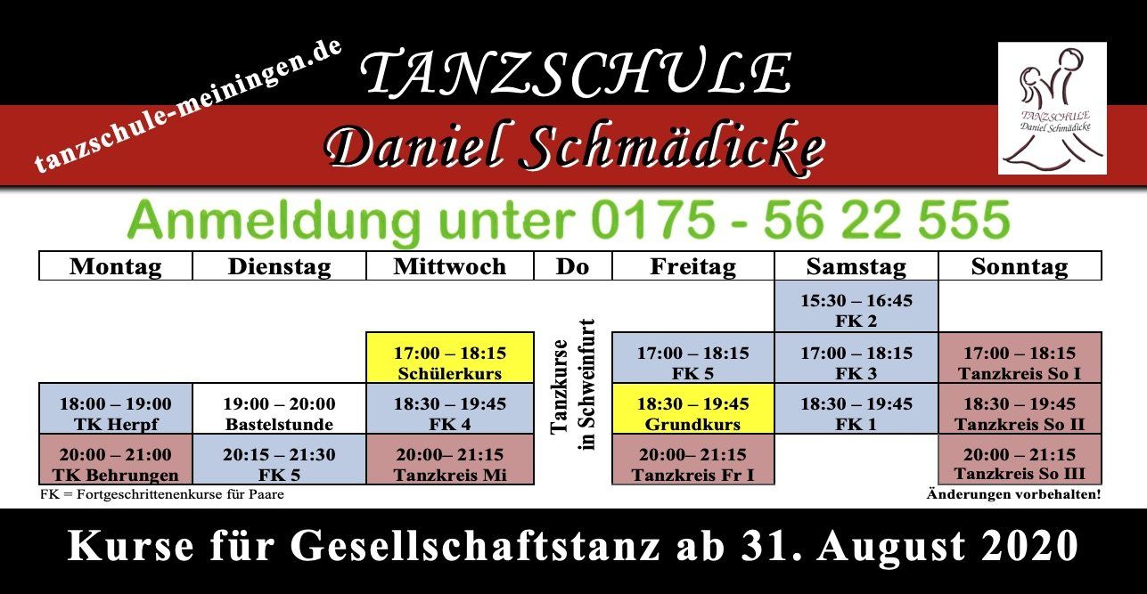 Das Glück auf Erden, ist ein Tanzpaar zu werden :-) - bestenfalls in der Tanzschule Schmädicke. Wir bieten seit 30.08.20 neue Kurse an - für alle Levels, ob Anfänger oder Fortgeschrittene. Wir geben tanzbegeisterten Mitmenschen die Möglichkeit bei uns tänzerische Erfahrungen in Standard- und Lateintanz zu sammeln. In geselligen Kursrunden kann man wöchentlich Tanzerfahrungen bekommen und ausbauen sowie neue Freundschaften entwickeln. Jetzt liegt es an allen Tanzwilligen, zum Tanzen zu kommen. Es gibt noch freie Kapazitäten in allen Kursen. Ohne Tanzpaare, keine Kurse - ohne Kurse, keine Tanzschule! Tanzt mal drüber nach! Die Tanzschultür steht offen ... Lasst uns Tanzen ;-) Cornelia Schmädicke